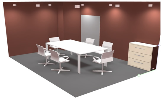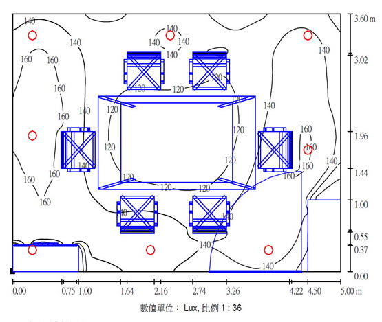 設計者的意思擺設該光源(相當於擺設燈具),在適當的設置時,舉例,此處是做某洽談室的室內的燈具配置以及照度分佈的效果,如圖四的照度分佈結果。