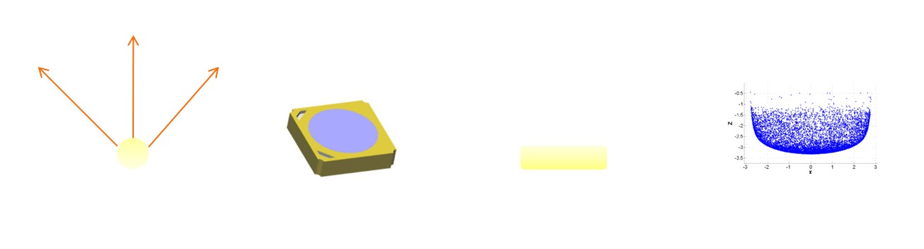 當決定要開發二次配光的關鍵光學件之際,首先要面對的,必須是決定LED光源是應該採用何種方式來建構?下圖是常見的四種光源建置方式,由左而右依序各為點光源、封裝光源、切趾光源以及 量測式的光源檔。
