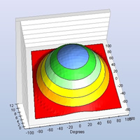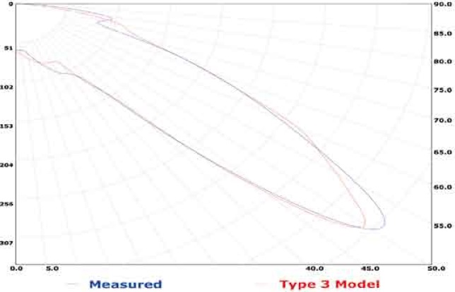 引用LED Professional[2]的2008年11/12月的期刊中的"LED Source Modeling Method Evaluations",作者是Mark Jongewaard和Kurt Wilcox[3]。Type 1編號,指的是取用Radiant Image的光源檔,LED幾何外形只是參考用,無光學屬性;Type 3編號,是指利用Photopia[4]建立的精確封裝光源模擬零件檔,包括LED光源的封裝膠的特性,以及LED支架的反射特性,並以模 型的方式建立發光晶片;把Type 1的光源匯入到一個標準的路燈設計檔案,並分析得到的結果如圖四的紅色線,而圖四的黑色線是實際成品所量測到的光強結果;兩條曲線比較,在低角度處的吻合度高,但在高 角度處,仿真和實測值,是有明顯的差異,尤其是最大角度位置,此值會影響到路燈規範是否滿足。